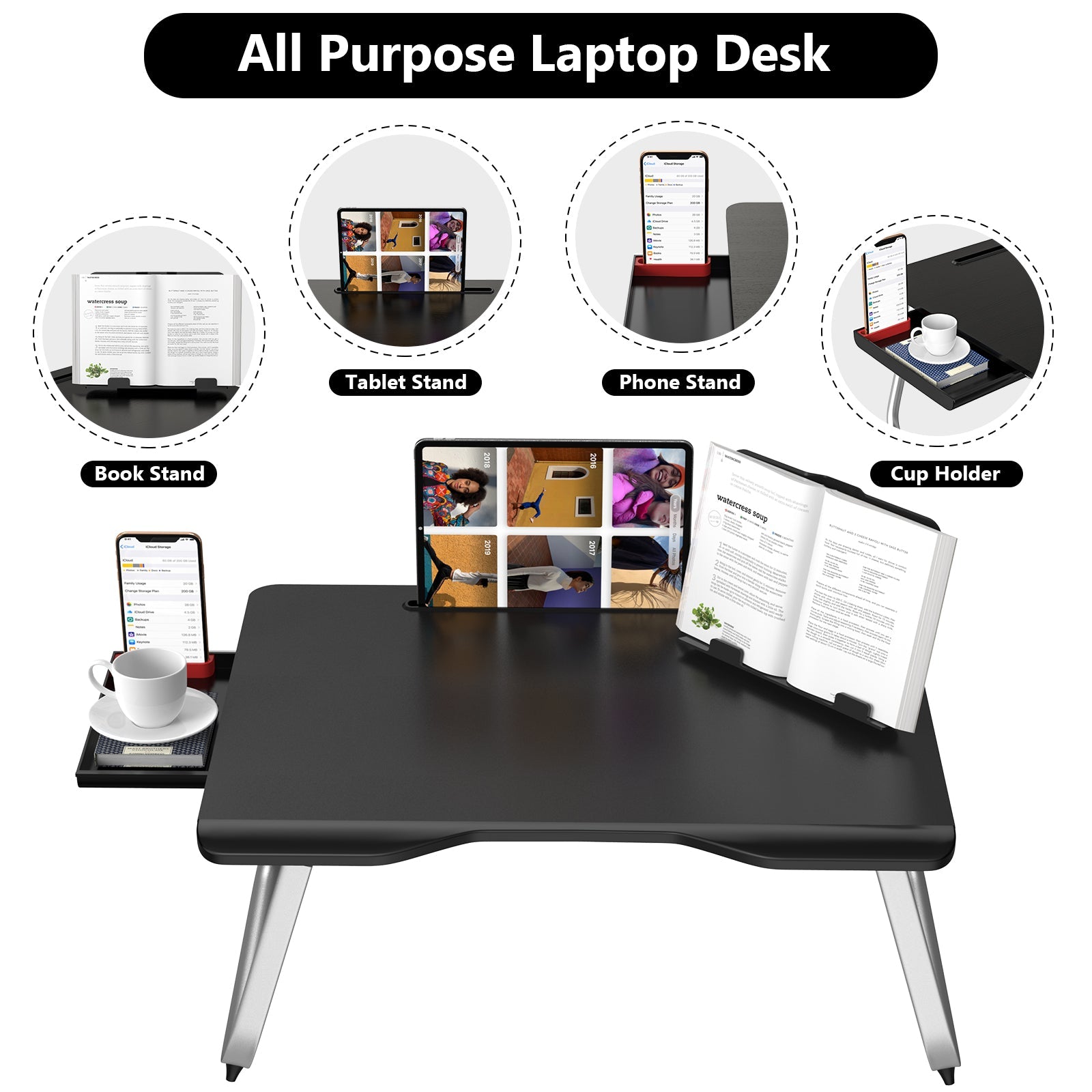 - Genius Design Holds It All - Drawer, Slide Outs, Grooves & Ample Desk Space on this laptop desk for bed and sofa hold your charging cables, cup, tablet, cell phone, pencils, pens, notepad and even your book...so you can study like you mean it, tackle work, or sit back and enjoy your binge session.