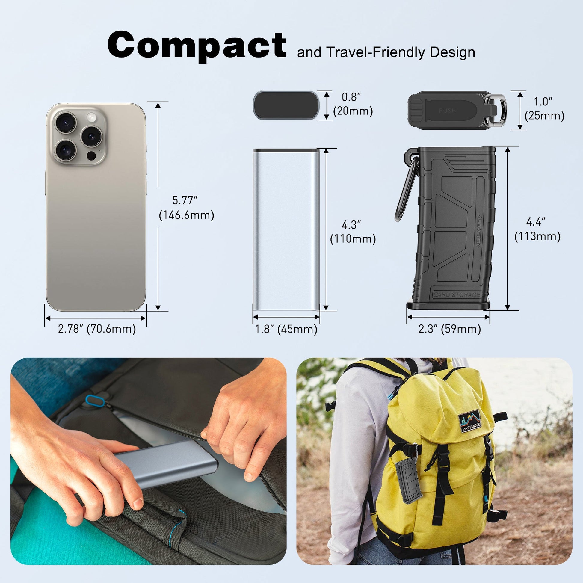 - Durable and Portable Design: Featuring an aluminum alloy shell with a silicone cover, this camera card reader offers robust protection. Its compact size and carabiner clip make it the perfect portable micro SD card holder case for on-the-go use.