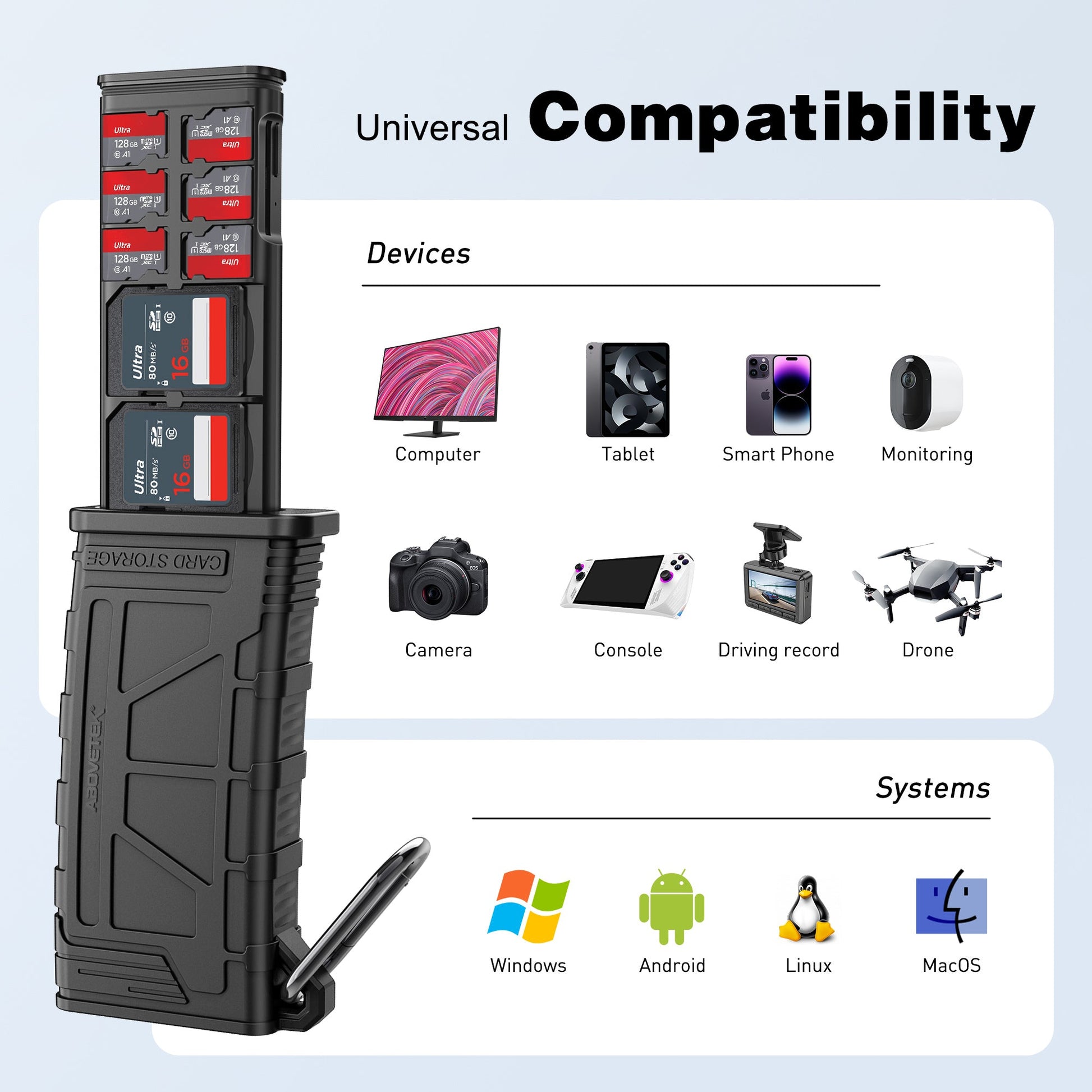 - Wide Compatibility: Supports UHS-II and SD 4.0 SDXC/SDHC/SD cards, plus microSDXC/microSDHC cards in UHS-I and UHS-II. This high-speed SD card reader is an essential SD card holder, compatible with Windows, macOS, Android, Linux, and iPhone.