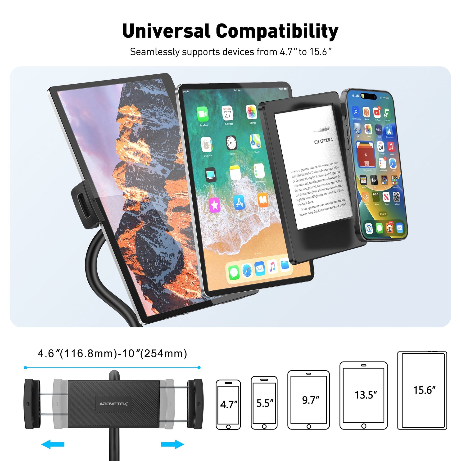 - Universal Compatibility: The universal tablet stand accommodating devices from 4.7" to 15.6". The adjustable bracket holder expands from 4.6" to 10", Perfect for any iPads, Kindles, phones, and portable monitors, it ensures comfortable viewing angles in any setting—be it reading or watching videos.