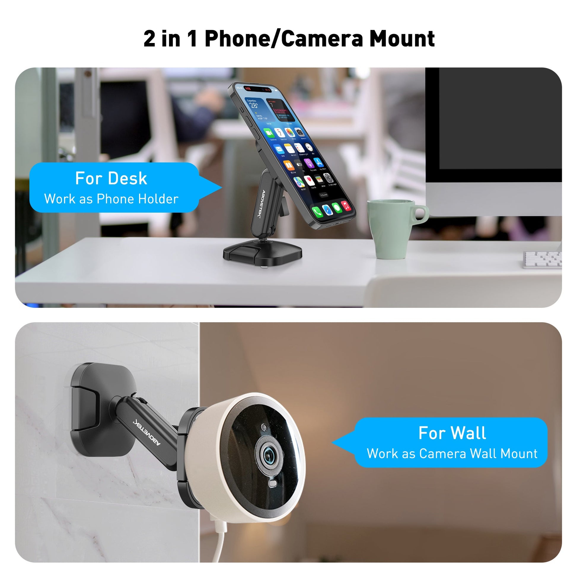 - Adjustable Dual-Ball Head Design: Equipped with a flexible 360° rotating arm and dual 180° ball head, this phone holder serves as a perfect camera adhesive wall mount for surveillance and a convenient shower phone mount, replacing tripods by securely positioning your phone for video recording.