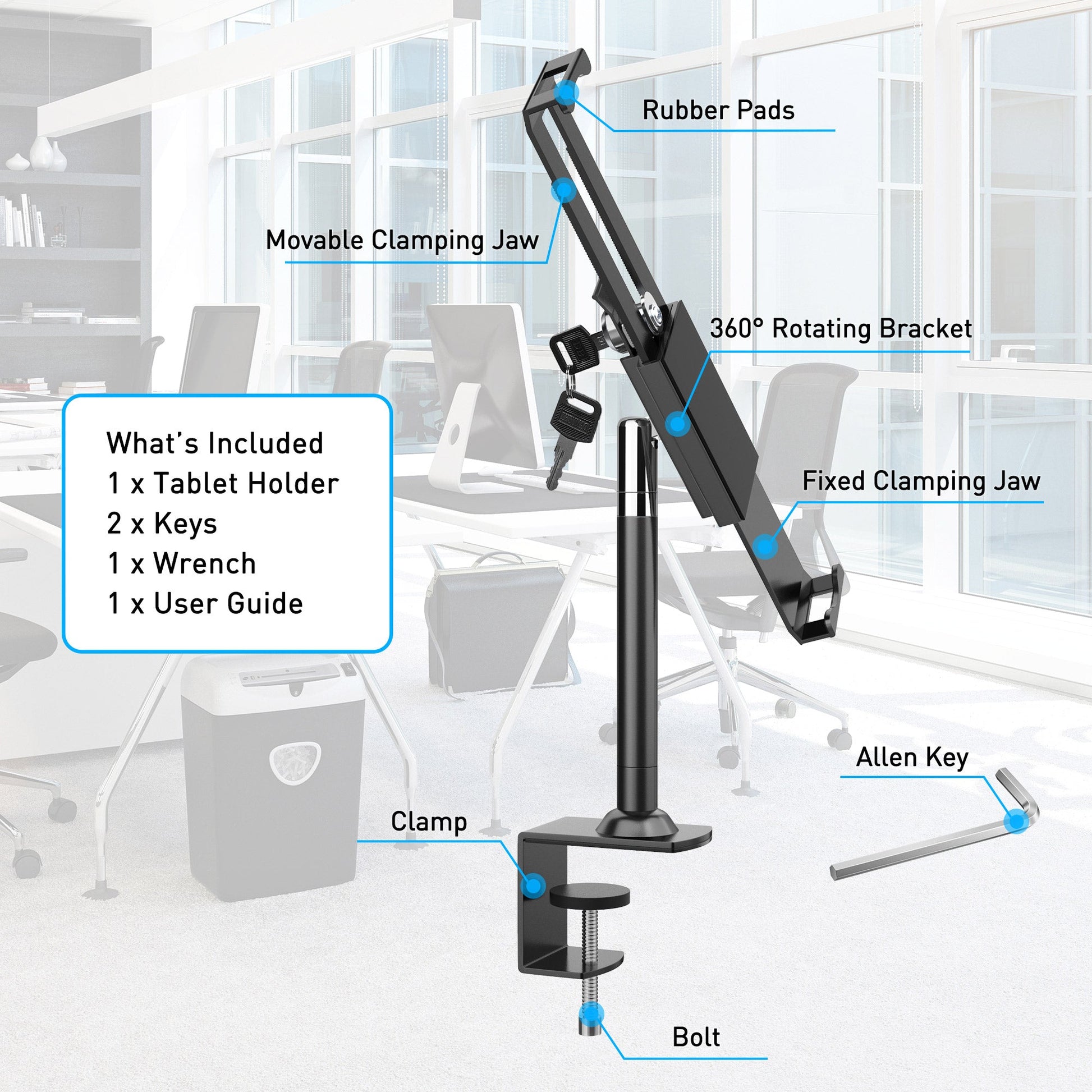 - TOTAL SECURITY in 1 MINUTE - EASY & HASSLE FREE: iPad locking tablet anti theft stand is as easy as mounting the ipad swivel stand holders to table base, tighten the ipad lock mount bolt, adjust anti theft ipad mount locking jaws around tablet and your tablet stand for retail is ready!
