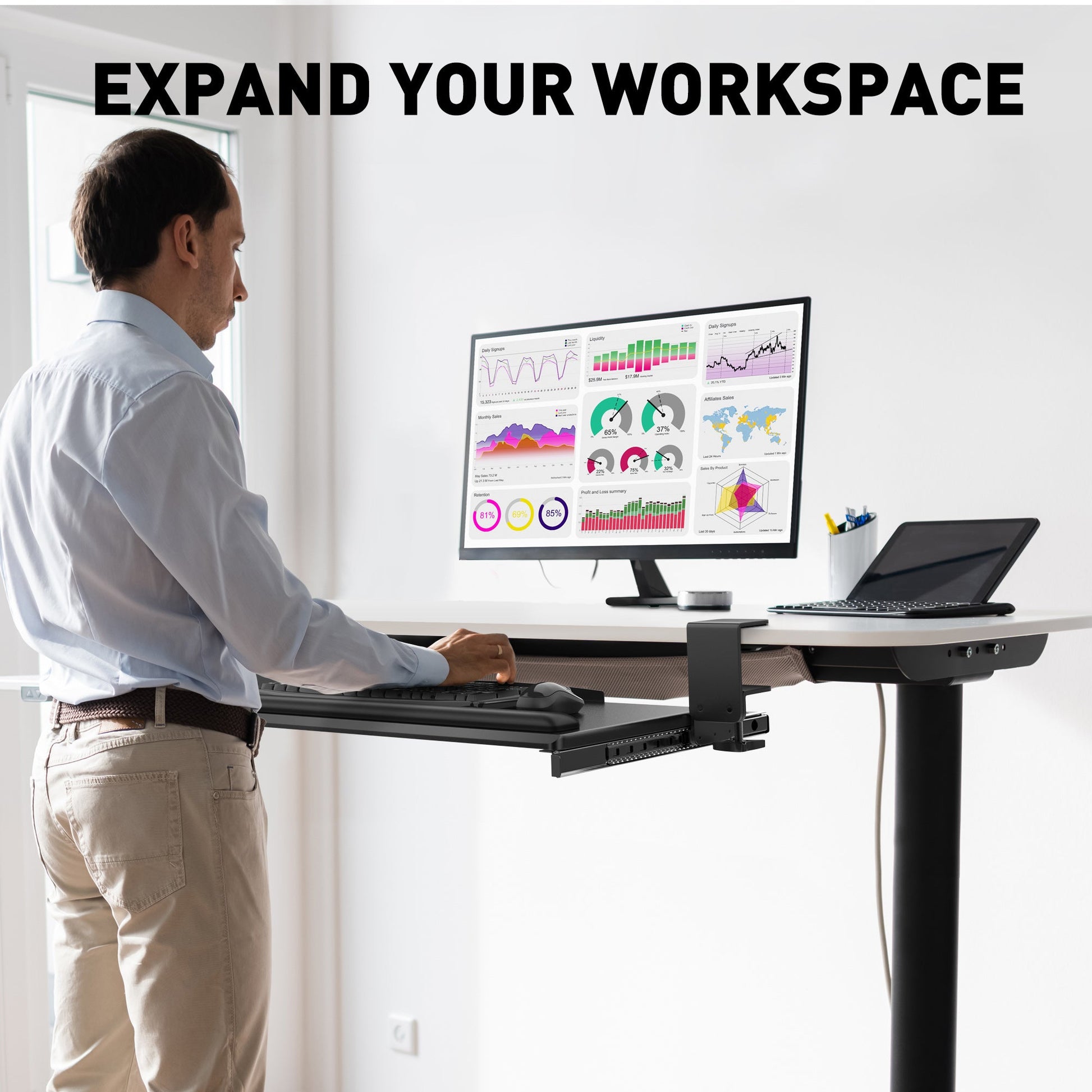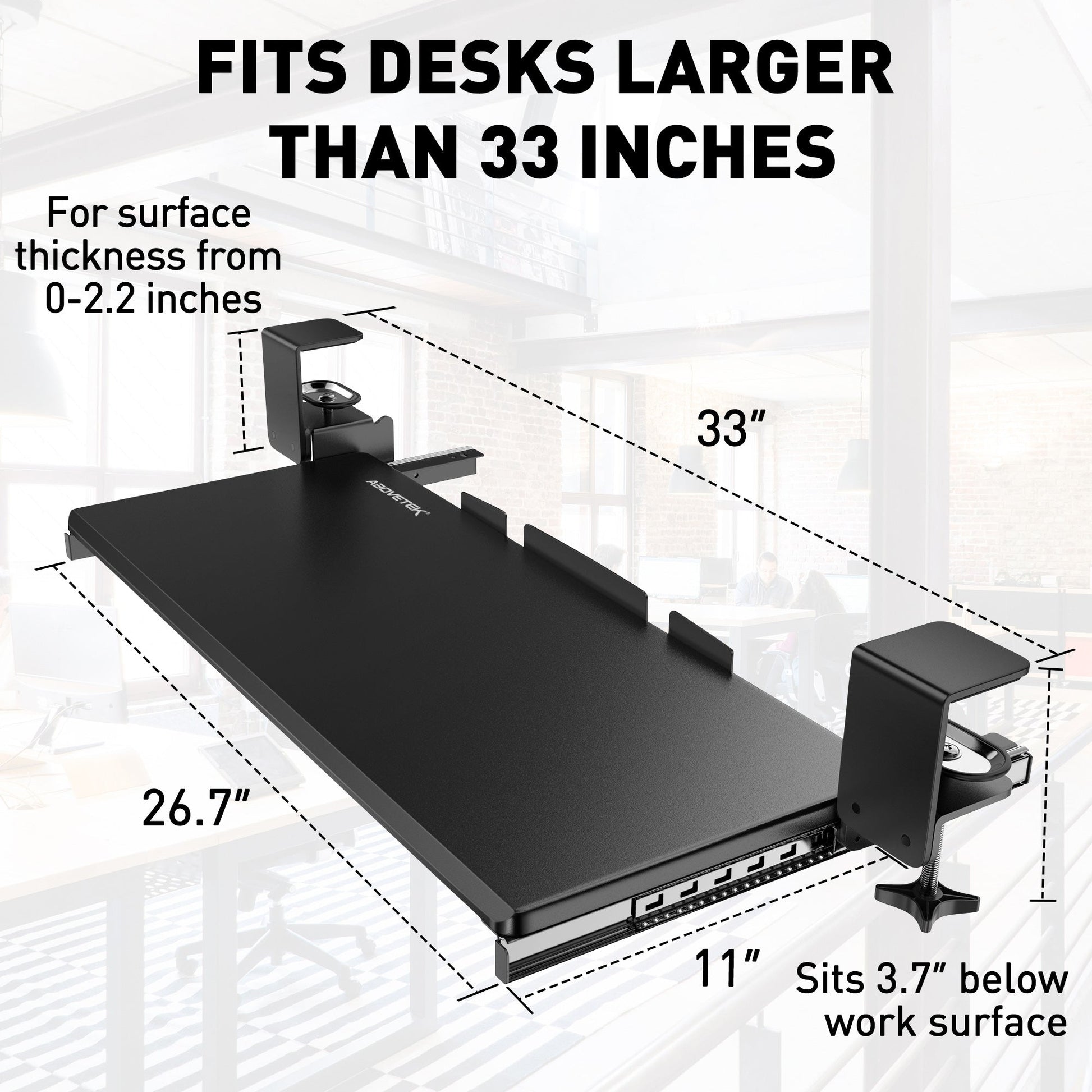 - Expand Your Desk Space: Recoup precious workspace by creating an additional layer under your desk with this large clamp keyboard tray, featuring an extra wide surface that provides plenty of room to fit a keyboard, mouse, and other desk supplies; the entire unit length from clamp to clamp is 33", please check your desk has that much space prior to purchase.