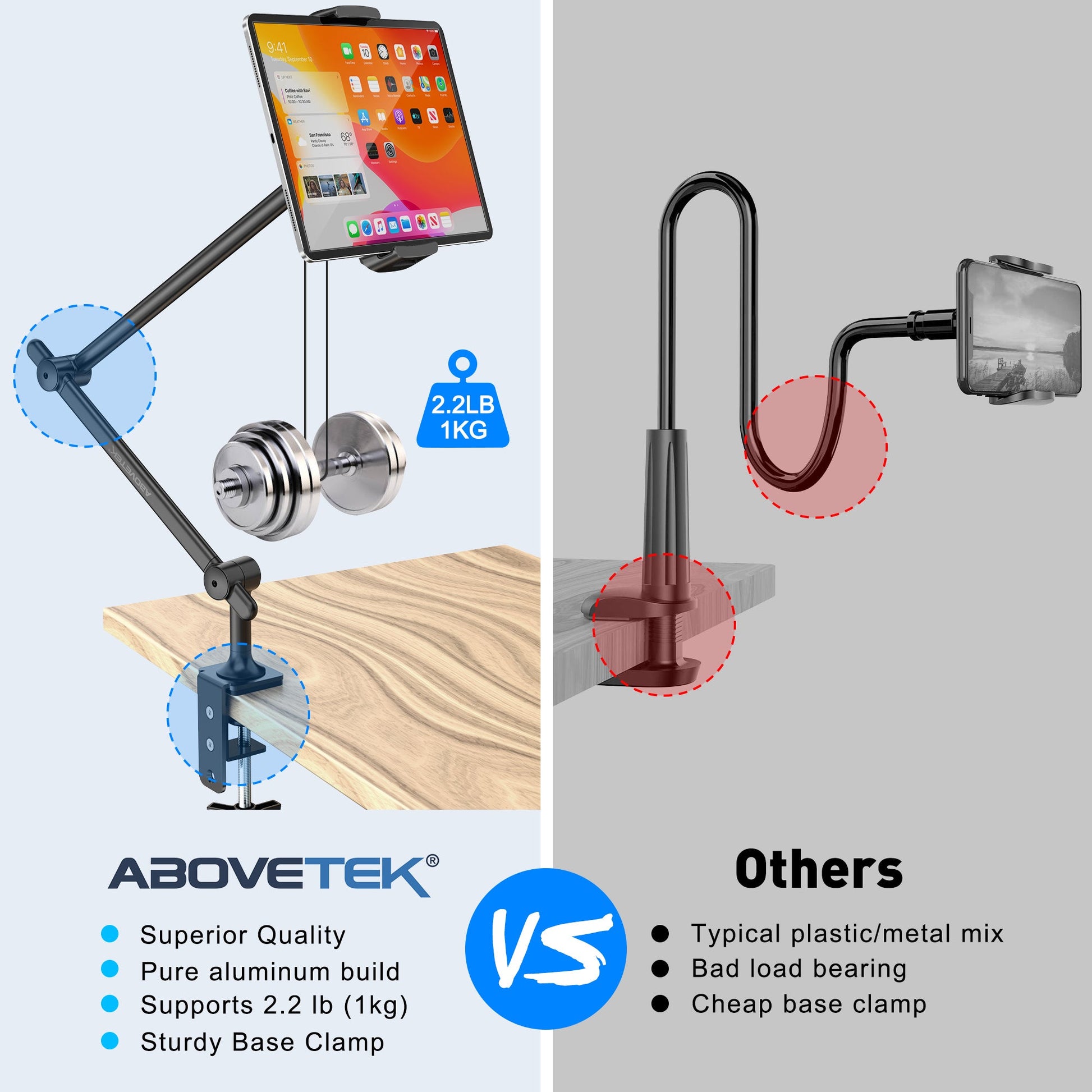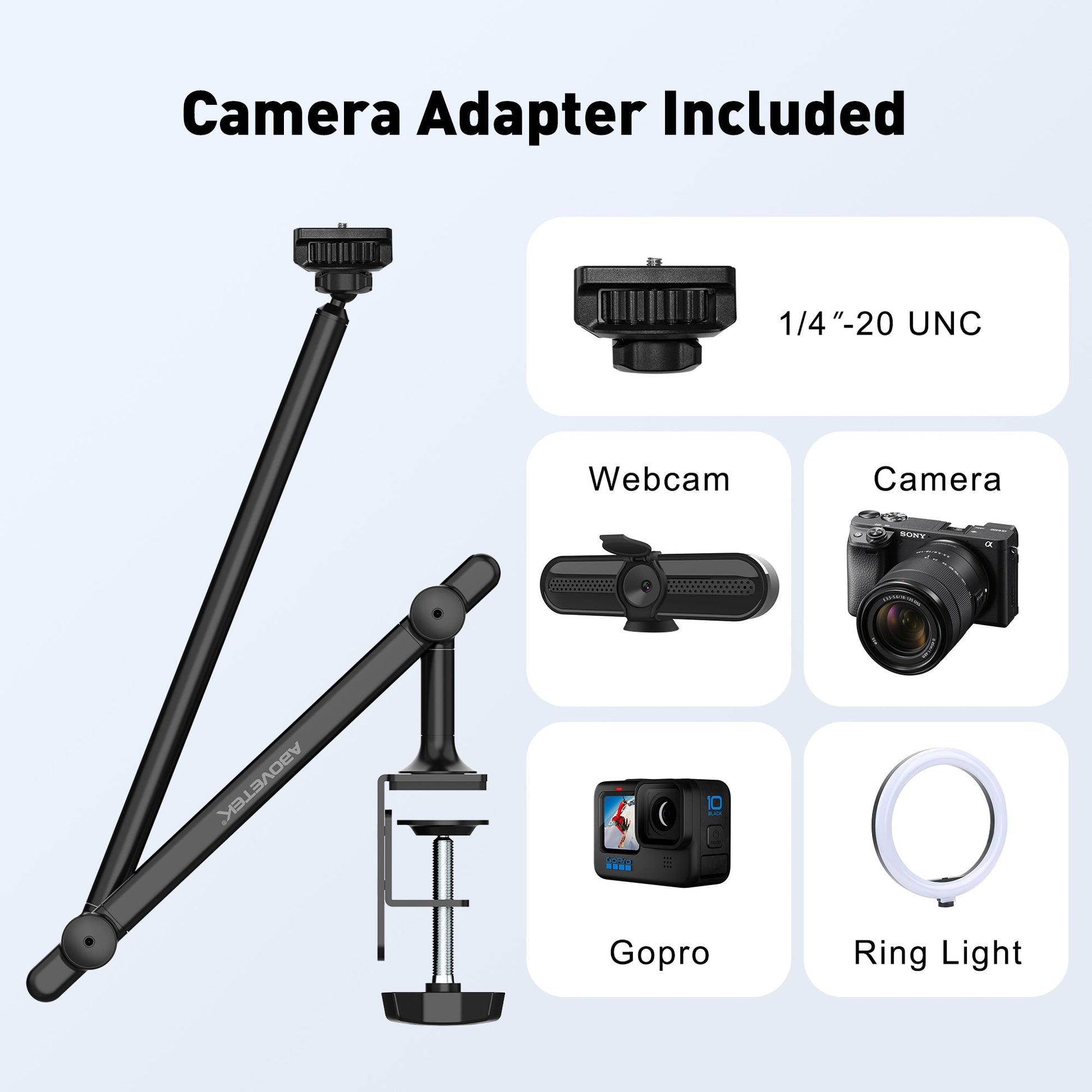- Versatile DSLR Camera Adapter & Tablet Desk Mount: Equipped with a universal 1/4" screw, it's compatible with webcams, cameras, GoPros, projectors, ring lights, and more. AboveTEK's ipad stand for desk ensures multifunctional utility for diverse needs.