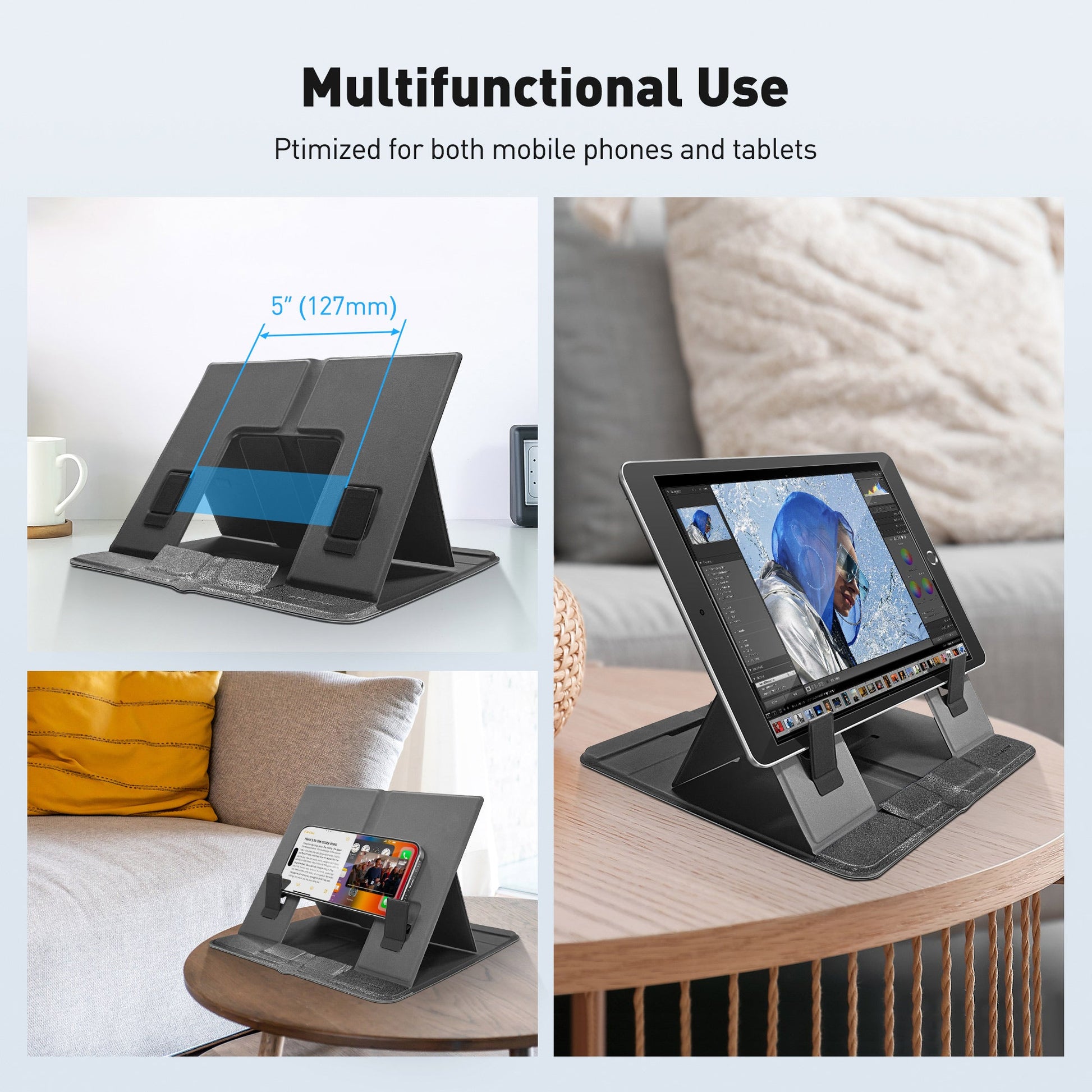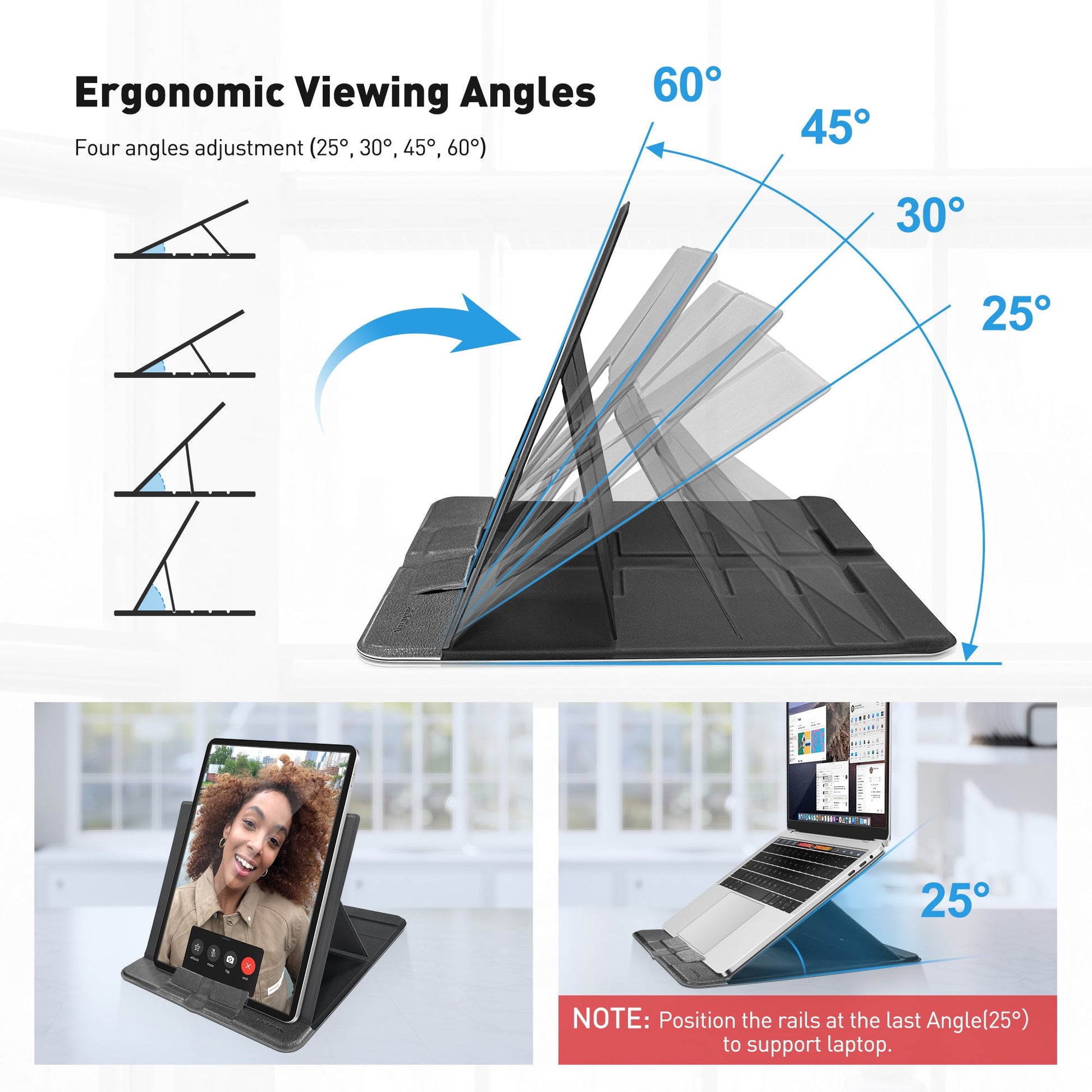 - Versatile & Portable: Embrace the convenience of our AboveTEK tablet stand, perfect for iPads, laptops and phones. Its foldable, wallet-style design makes it a travel essential. Experience ergonomic viewing with adjustable angles for comfort.