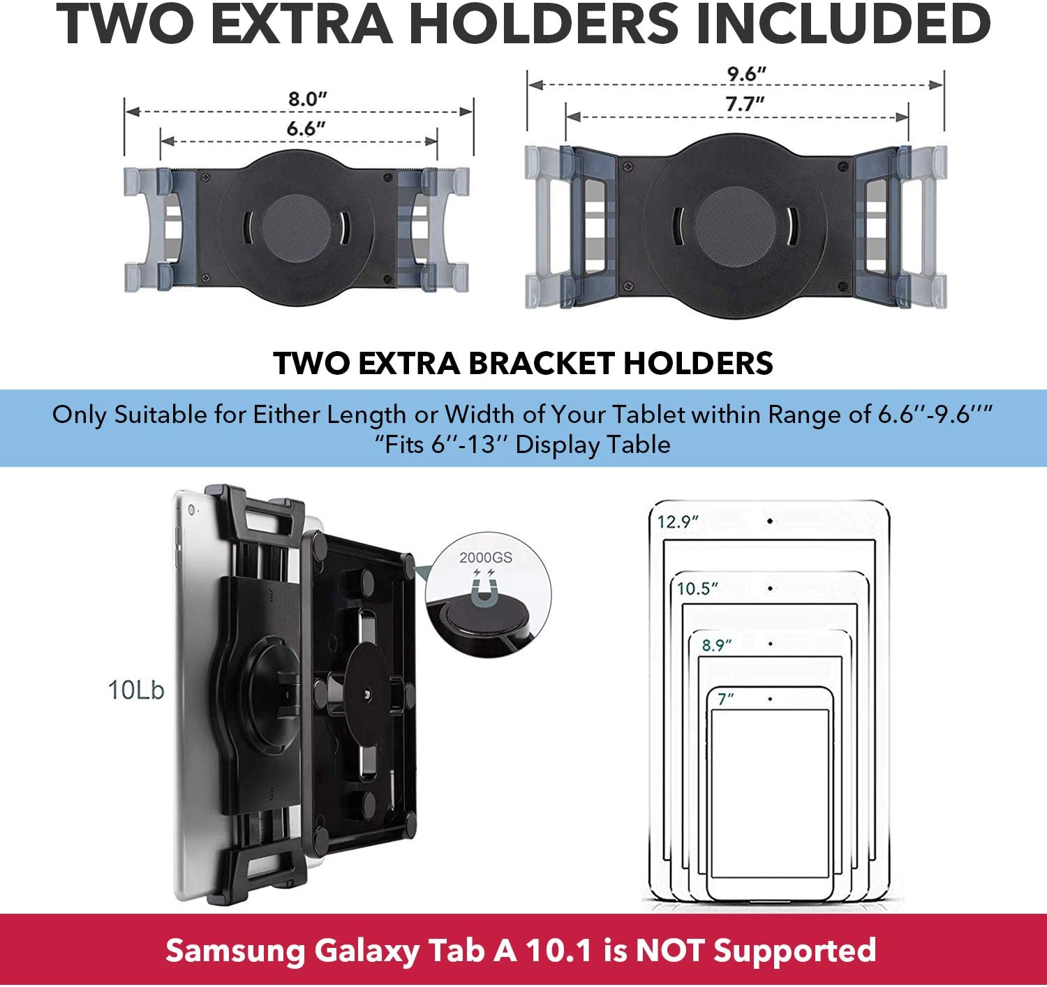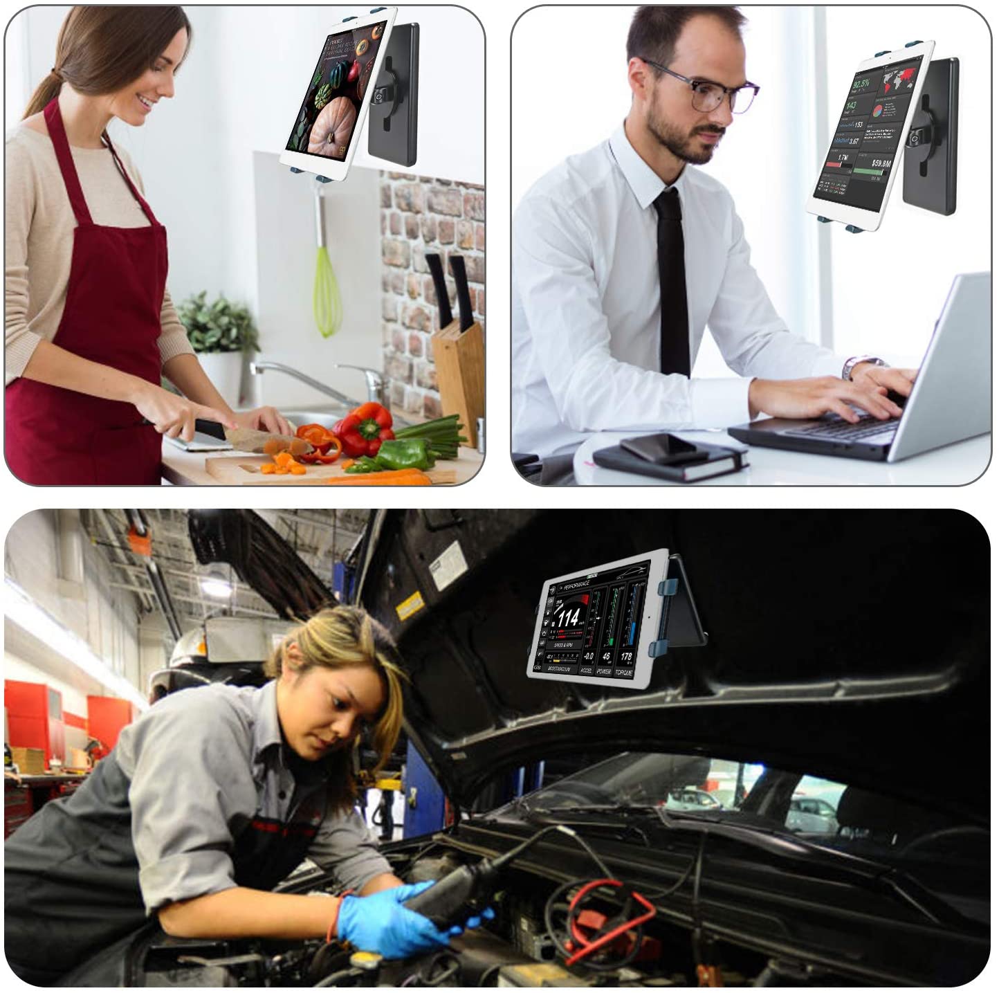 - 360° SWIVEL TABLET HOLDER - Highly flexible 360° swivel ipad holder combined with horizontal/vertical design offers great adjustment without missing any viewing angles in portrait or landscape display. Perfect magnet tablet mount for typing or showcasing at events or enabling mechanics to attach iPad to car panel/chassis for reading repair manual and multitask